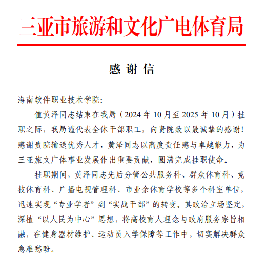 近日,三亚市旅游和文化广电体育局向我校发来感谢信,致谢我校为地方发展输送优秀人才,为三亚旅文广体事业注入强劲动力。对我校挂职干部黄泽同志的优秀表现予以充分肯定,并衷心期盼未来与我校深化合作,共助海南自贸港及三亚国际旅游消费中心建设。