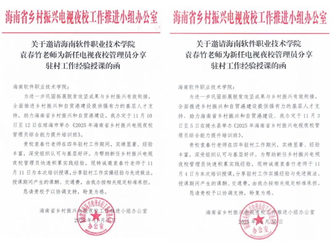正值海南全面推进乡村振兴与自贸港建设的关键节点,11月4日、11日,《2025年海南省乡村振兴电视夜校管理员综合能力提升培训班》先后在陵水、琼海顺利举办。我校袁春竹老师凭借四年驻村一线的亮眼实绩、扎实实操经验及基层高度认可,受邀为全省新任驻村第一书记开展专题授课,以“干货满满”的实战分享为新一批基层攻坚力量赋能。